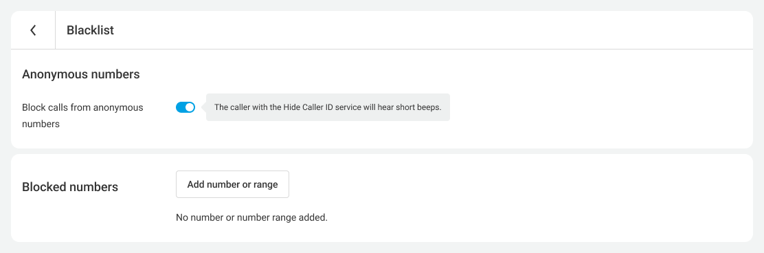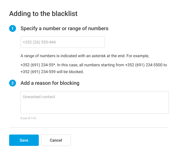 When entering blocked numbers, you can use a mask. For example, +49 (30) 1234-56*. This mask will block all numbers in the range of +49 (30) 1234-5600 to +49 (30) 1234-5699.
