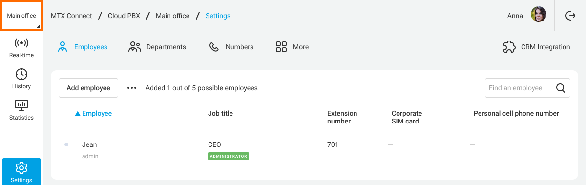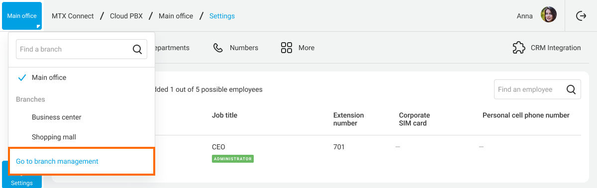 1. Branches. This section displays summarized data on employees, departments, numbers, and callback widgets across all branches. Here, you can create, configure, and delete branches.