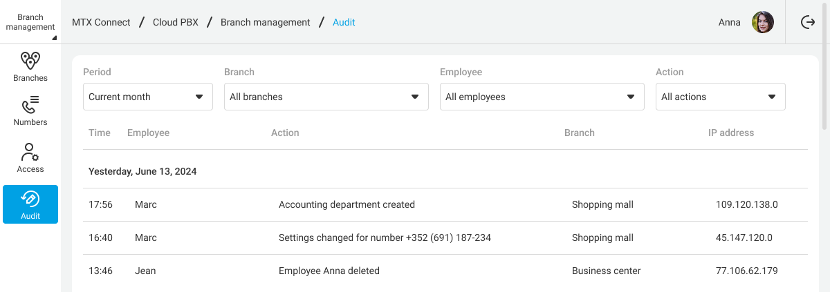 4. Audit displays the history of actions across all company branches. Unlike the action history on domains, here you will find a Branch column and a corresponding filter. For more details on audit capabilities, read the Action History article.
