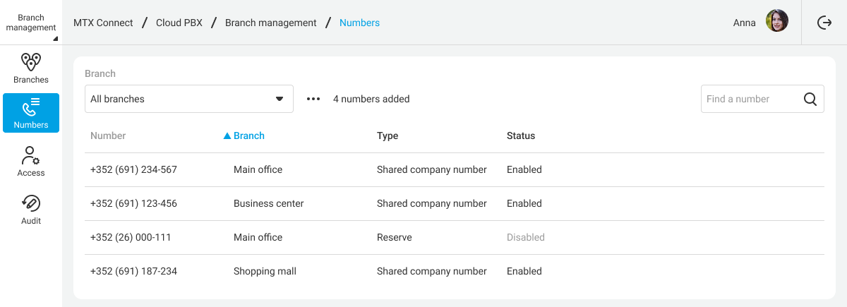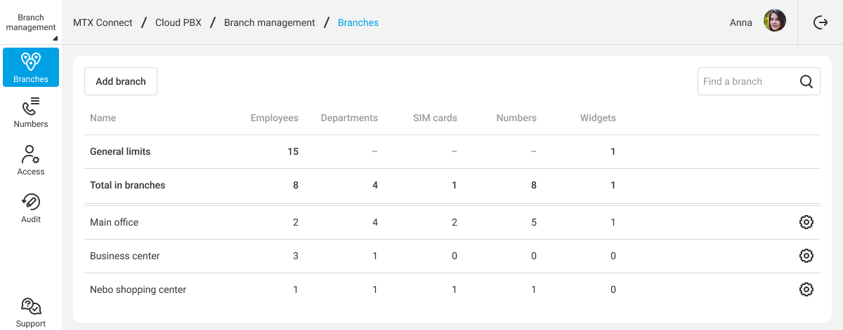 Companies with multiple branches can edit Cloud PBX settings for all branches in a single window. Below, we will detail the capabilities of the branch management dashboard by each section.