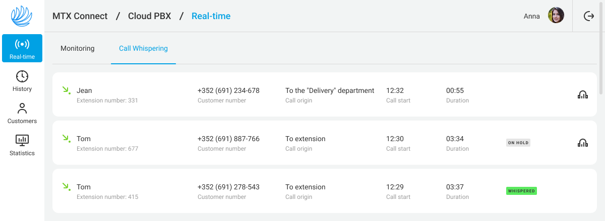Online Listening and Call Whispering will be useful in training new managers — you will introduce new employees to real calls faster, without fear of losing customers’ trust. After all, employees will hear your comments and will be able to correct their mistakes right on the phone call.