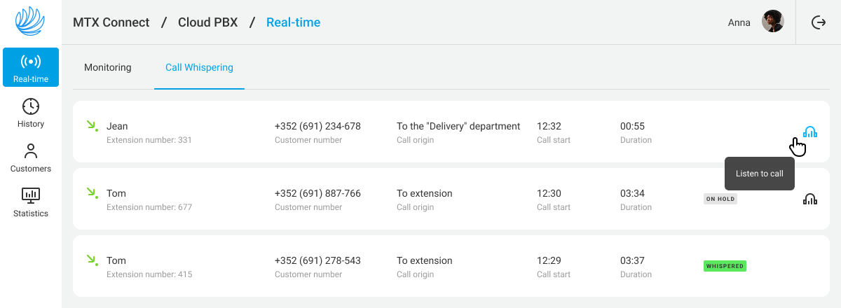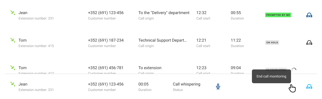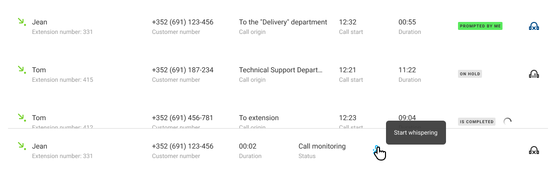 To find out which employees are currently talking on the phone and with whom they are talking, go to the Call Whispering tab and select a call with the headphone icon on the right.