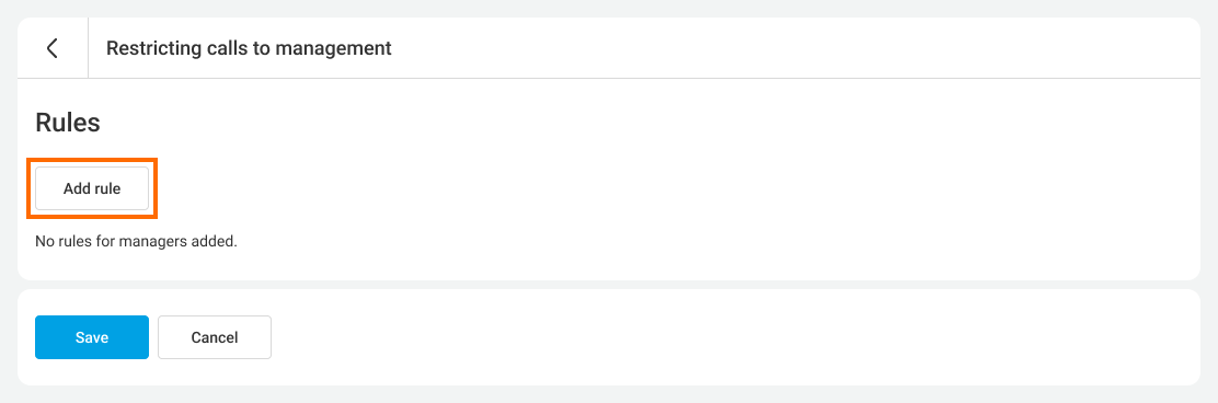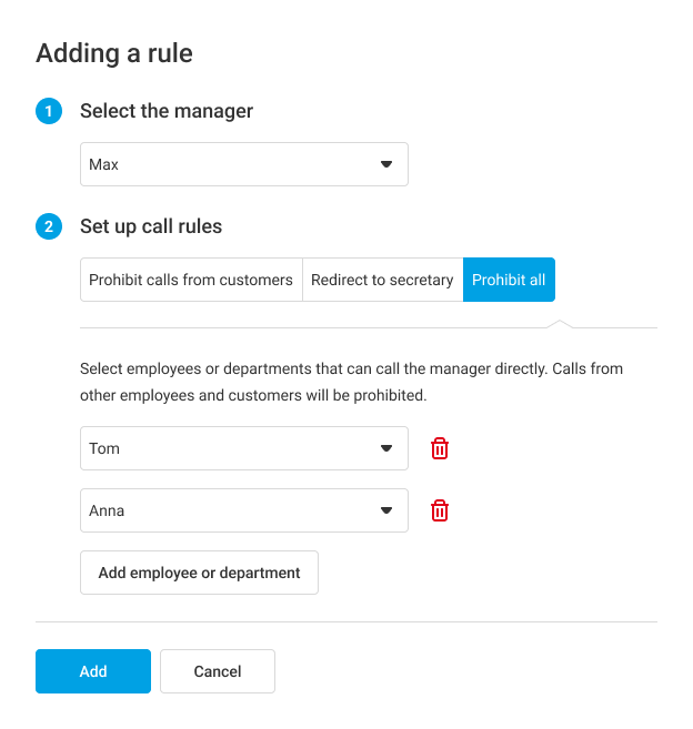 4. When you have set up the rule for restricting calls to the manager, click Add. Check the added restrictions — if you need to edit them, click on the gear icon. If a rule becomes irrelevant, you can delete it by clicking the trash can icon.