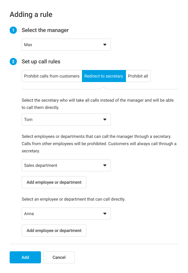 Then, select departments and employees who will be able to call the manager through the secretary — calls from other employees will be prohibited.