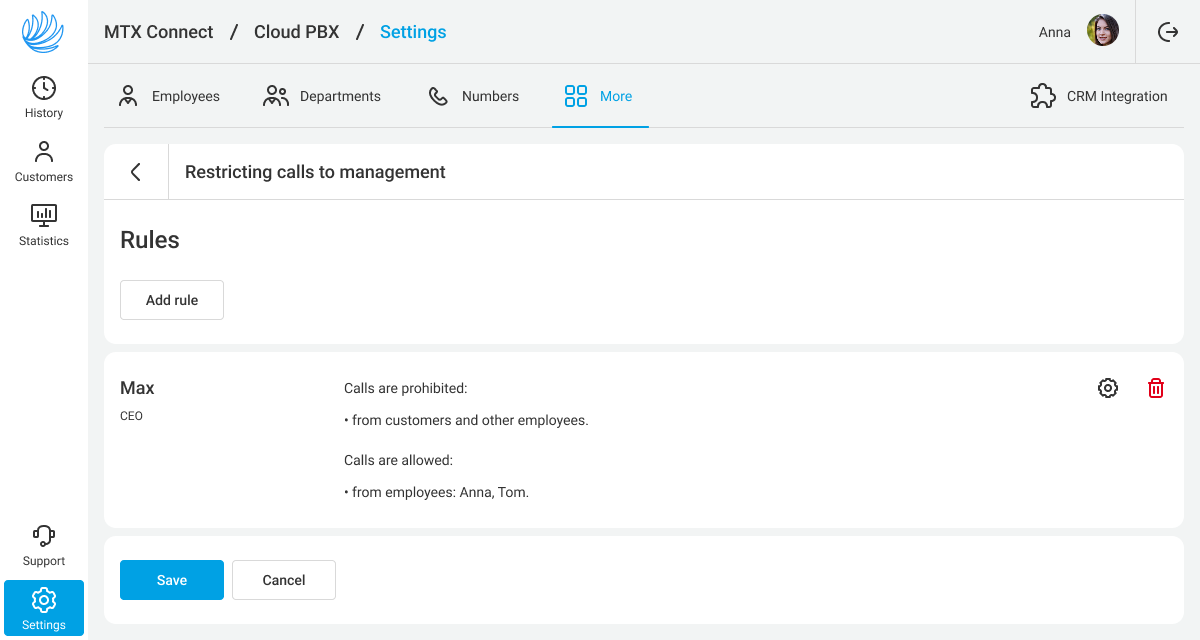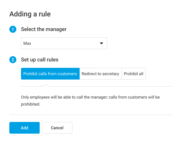 - Prohibit calls from customers — only employees will be able to call the manager via Cloud PBX. This is the default option.