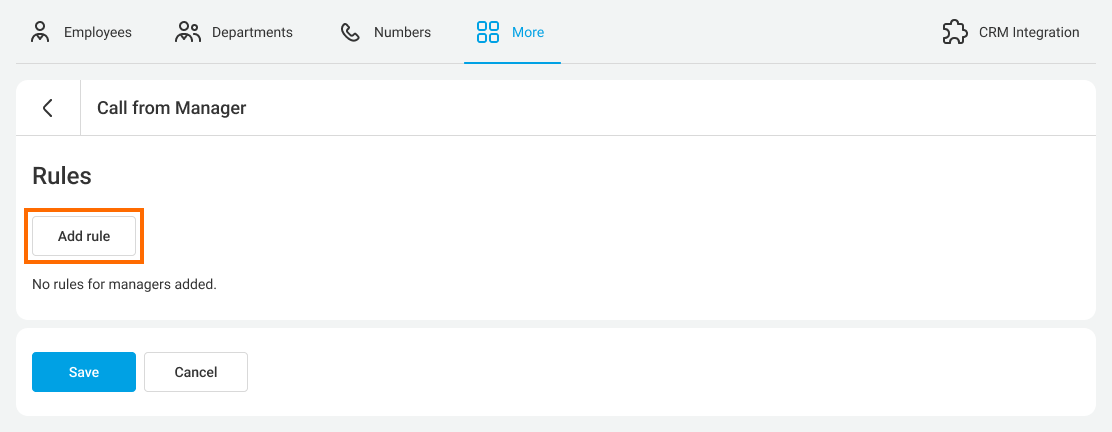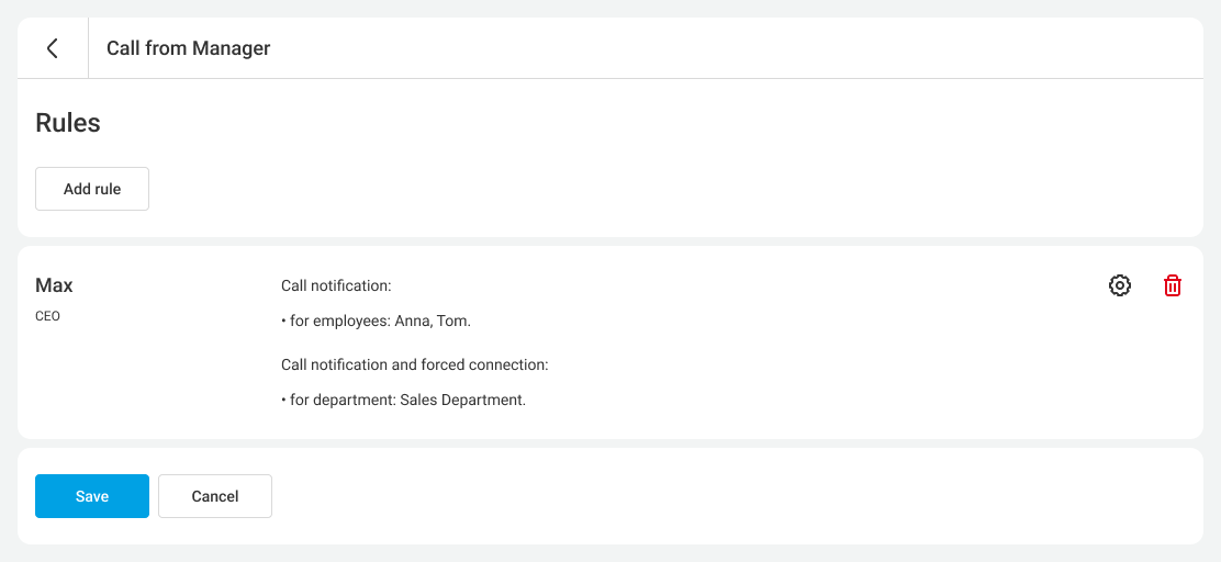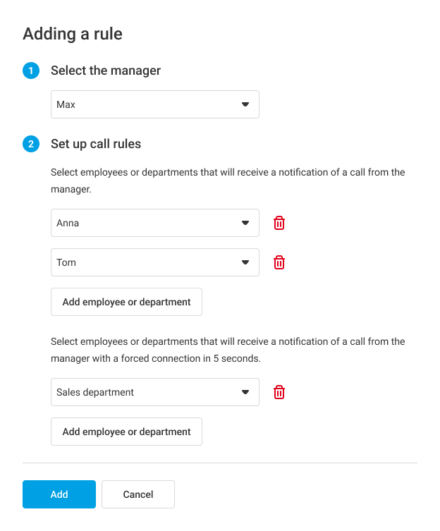 Select an employee for the enforced connection to the manager upon a call. With this setup option, the employee will first hear the “The manager is calling“ notification, and, after 5 seconds, Cloud PBX will connect them to this manager. At the same time, Cloud PBX will put their current call on hold. During these 5 seconds, the employee can warn the other person about the call from the manager and ask them to wait on the line.