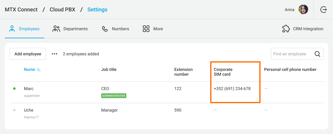 Only a user with the Administrator rights level can assign a corporate SIM card to an employee. After that, the corporate SIM card will immediately become the employee's personal number in Cloud PBX.
