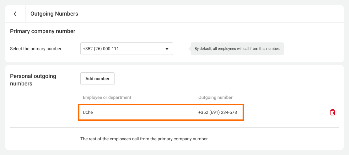 Go to the More tab → Outgoing numbers and delete the personal outgoing number setting for the employee. To do this, click the red trash can icon to the right of the outgoing number settings in the Personal outgoing numbers subsection. Then click the Save settings button at the bottom of the page.
