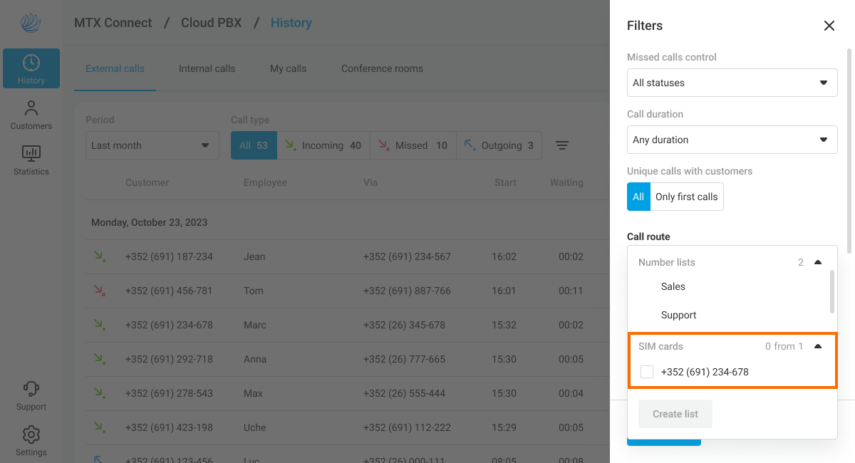 In History and Statistics, all incoming calls to a corporate SIM card number can be viewed separately from other calls. In the Via number filter, corporate SIM cards are grouped in a separate section.
