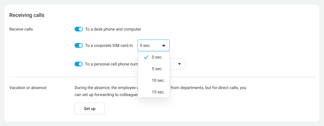 3. When you select a corporate SIM card, it will automatically start receiving calls — the switch in the Receiving calls section will automatically move to the active position.