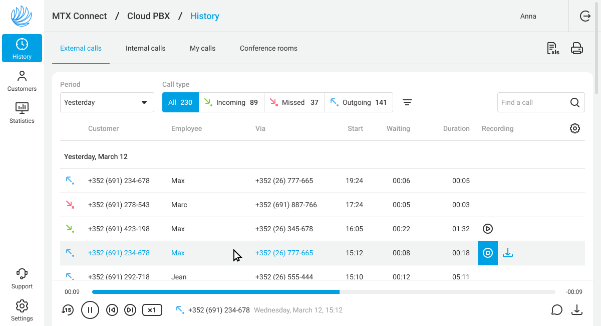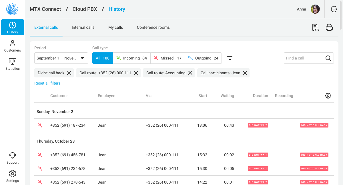 Our call history captures all incoming and outgoing calls made from mobile phones, SIP phones and softphones, including calls between employees of the same PBX using extension numbers and calls between employees from different branches.