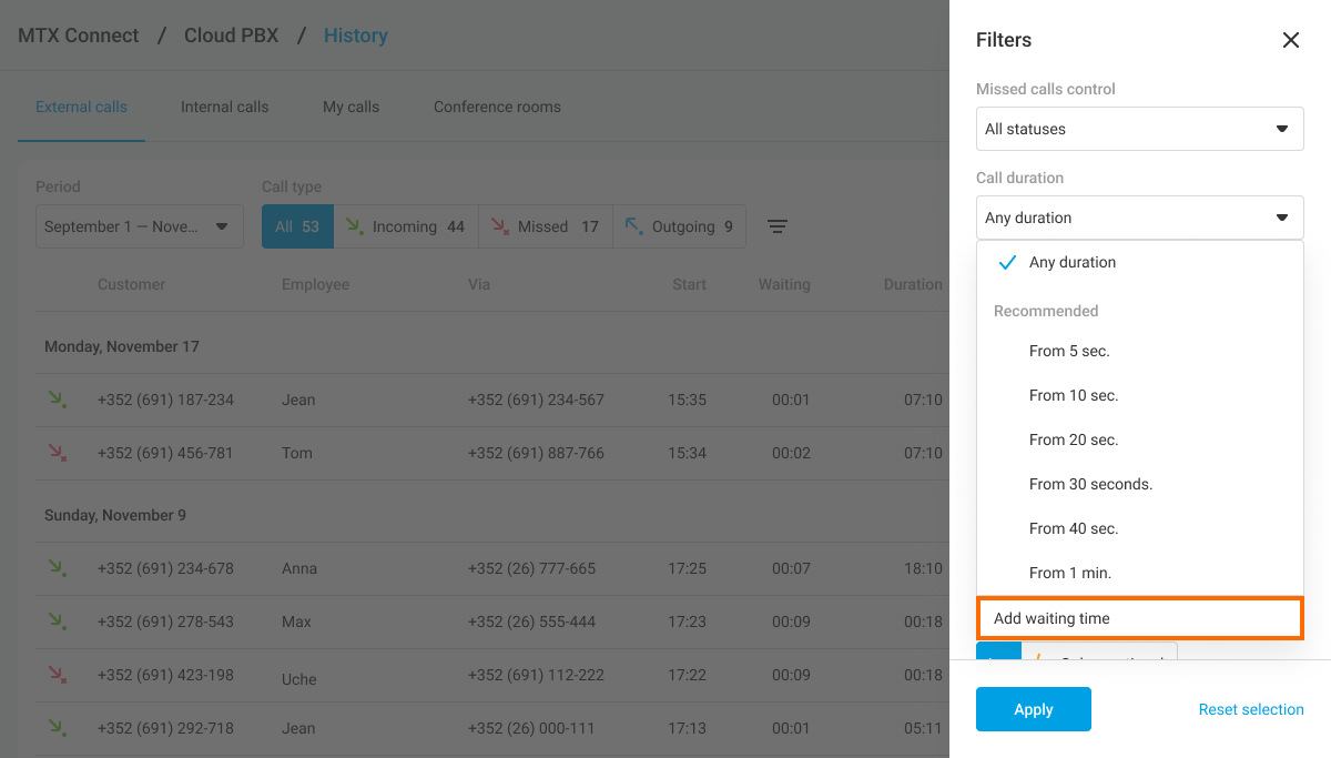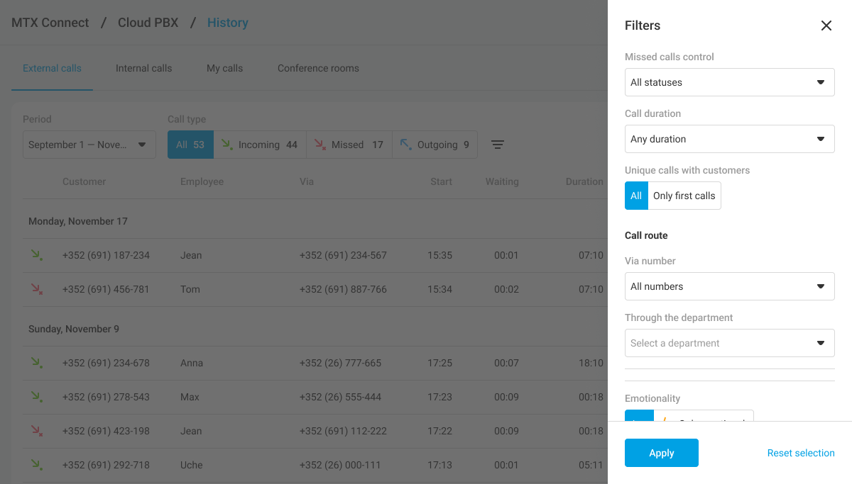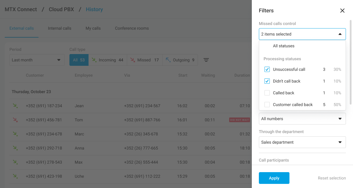 In the Call participants filter you can not only select each employee individually, but also set up a filter for all employees of the required department at once. When you select all employees of the department, all calls involving each employee will be displayed in the history, including direct calls to extension numbers. The Call participants filter also shows call attempts, which helps you monitor the total number of incoming calls for each employee.