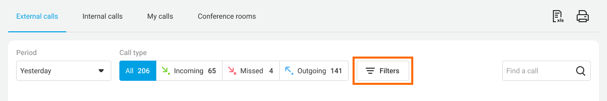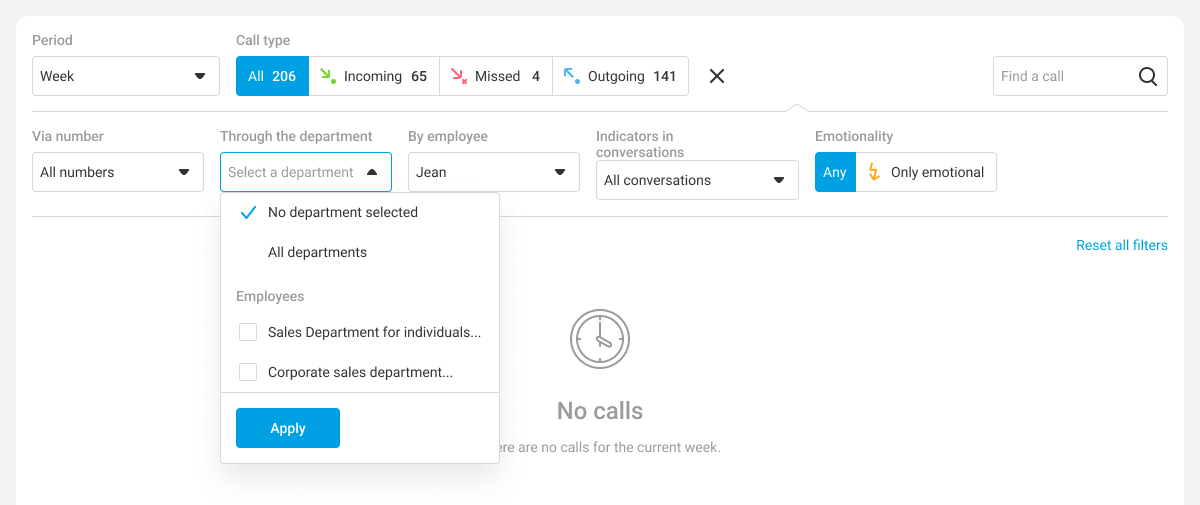 Click the Filters button to sort calls by numbers, departments, employees and missed call processing statuses.