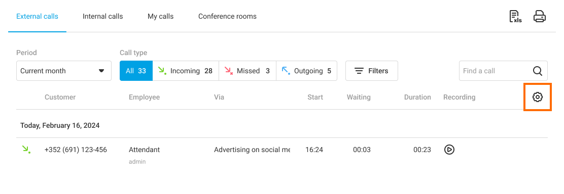 Sometimes it is important for a manager to see in History not the employee who ended the call, but the one who answered it. By default, the column displays the one who ended the call. To change this setting, click on the gear icon under the search bar.