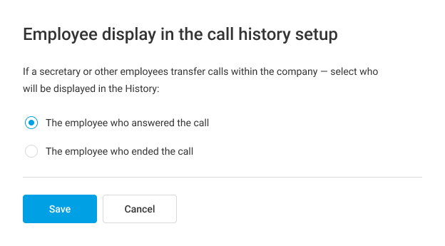 The Employee column settings affect whose name you will see on the External calls and Internal calls tabs.Cloud PBX remembers the employee display option that you selected in the corresponding column. Even if you log out of your personal account, the Employee column settings will be saved the next time you log in. Only users with the Head of Department and Administrator roles can set up the Employee column. Users with other access levels always see the employee who ended the call in History.