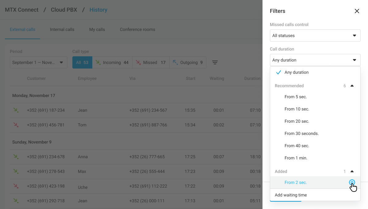 When setting up a filter, you can select standard values or add your own. For the latter in the drop-down list of the Call duration filter, click Add duration.