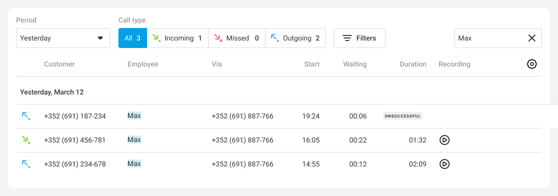 With this Employe column display you can monitor the work of secretaries and administrators — filter and listen to all the calls they have taken to make sure that these employees are following the communication standards of the company.
