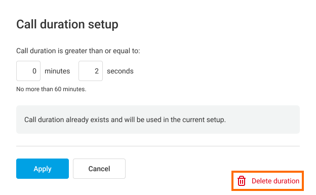 To change or delete an added call duration, in the Call duration filter hover over the required value and click the gear icon to the right of the time.
