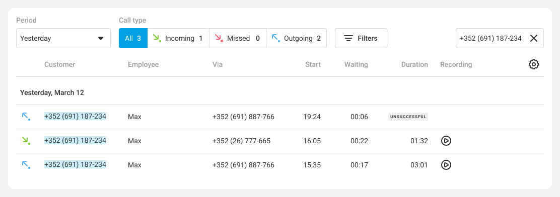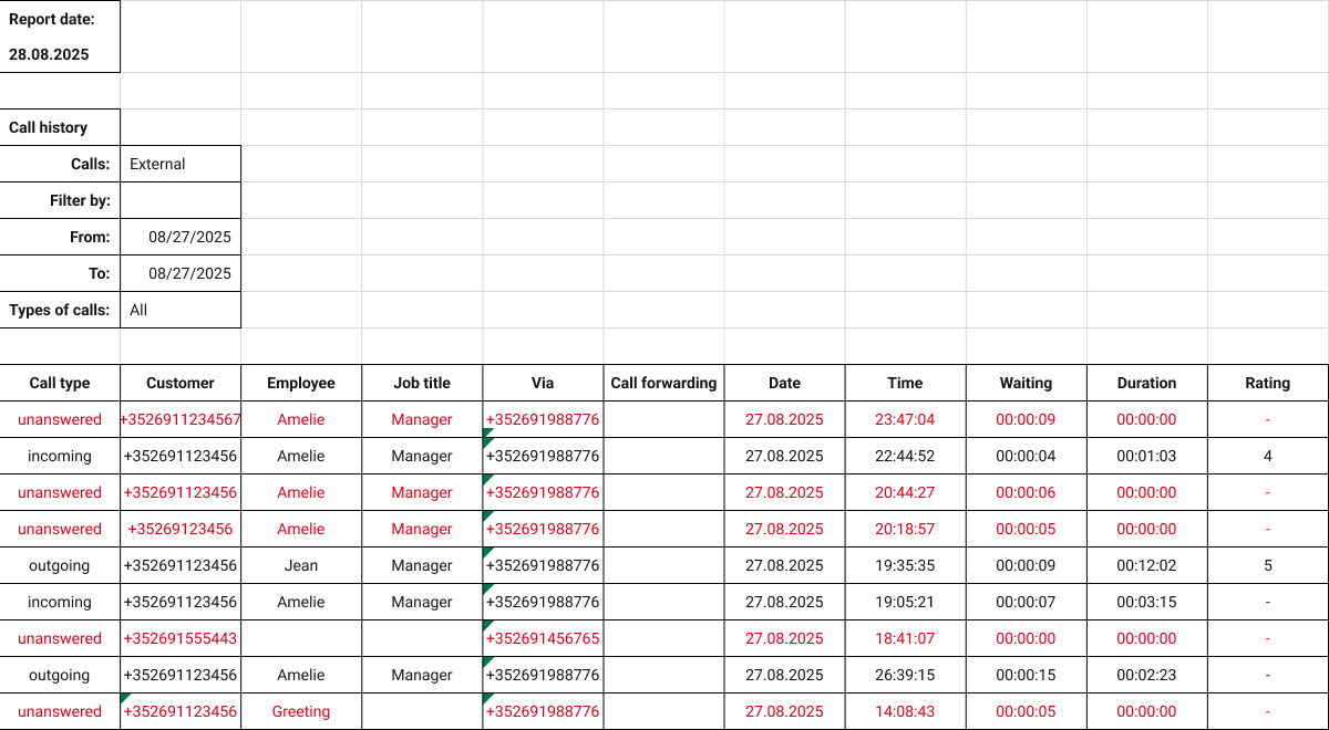 - filter calls by any period, customers, employees, call types and duration, etc. for the required period;