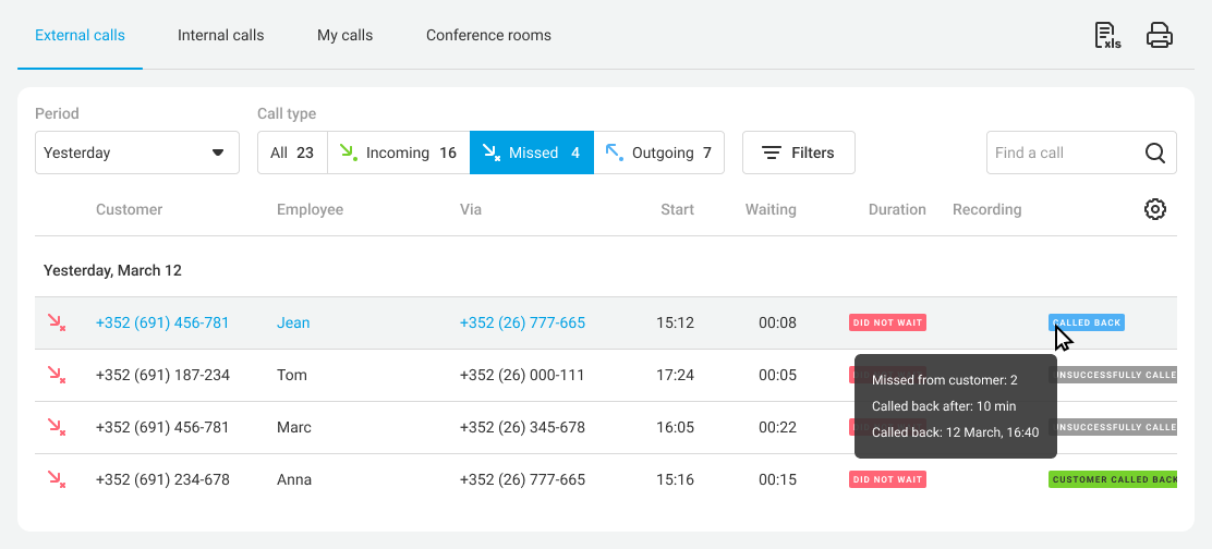 - monitor calls that need special attention (missed calls that were not called back or were called back unsuccessfully; calls with service quality assessment);