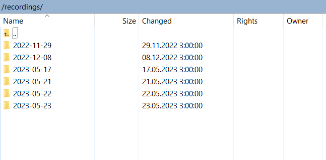 The files are located in Recordings catalog and organized in subcatalogs based on the date in the YYYY-MM-DD format: