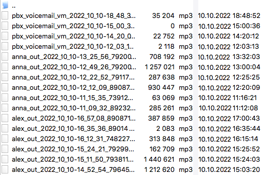Inside the folders, the recording files have names following the anna_out_2022_10_10-12_49_26_490302343341.mp3 pattern where: