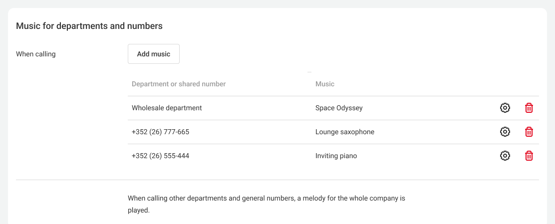 To change the music for a department, click the gear icon located to the right of the department name and music. To remove the music settings, click the trash bin icon.