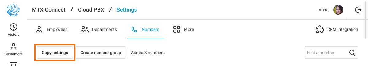 1. Go to the Settings section on the Numbers tab. Click the Copy settings button.