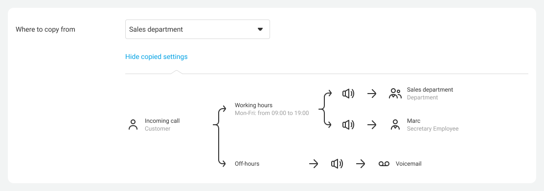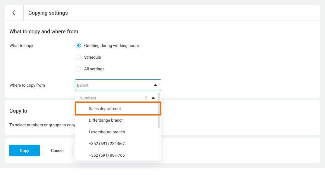 Below you will see and be able to check the settings you want to copy to another number: the call reception scheme, work schedule or greeting settings.