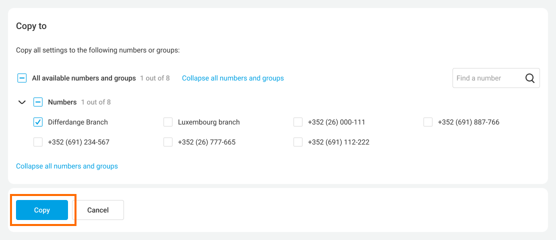 4. Check the boxes where you want to copy the number settings to. You can copy the settings to individual numbers, as well as to groups of numbers.