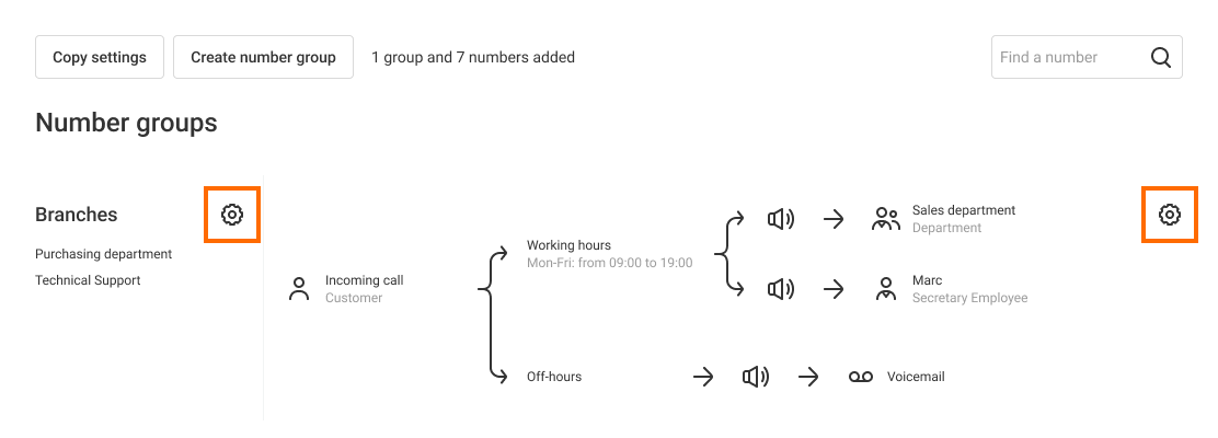 - if you need to change the rules for receiving calls, the schedule, the greeting in the number group, click on the gear icon to the right of the call reception scheme.