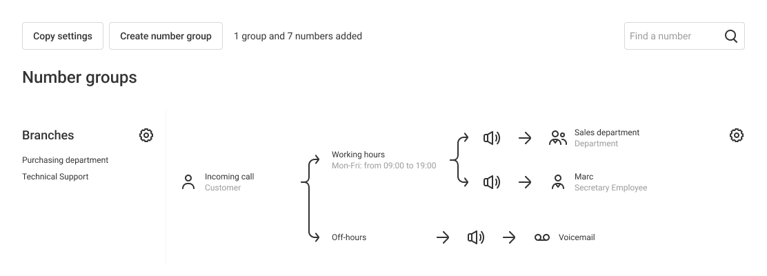 If you have many numbers that work the same way, you don't have to go into the settings of each number separately to change the schedule or greeting. Cloud PBX allows you to save time and edit any amount of numbers in bulk — you can combine numbers into groups with the same settings or copy the number settings.