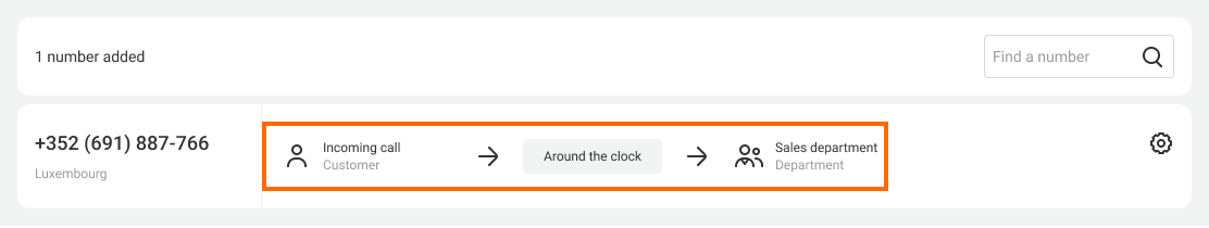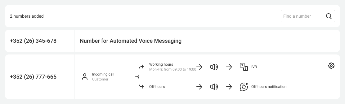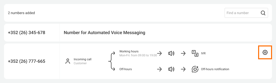 1. Go to the Numbers tab in the Settings section to see a current call-receiving scheme for your numbers.