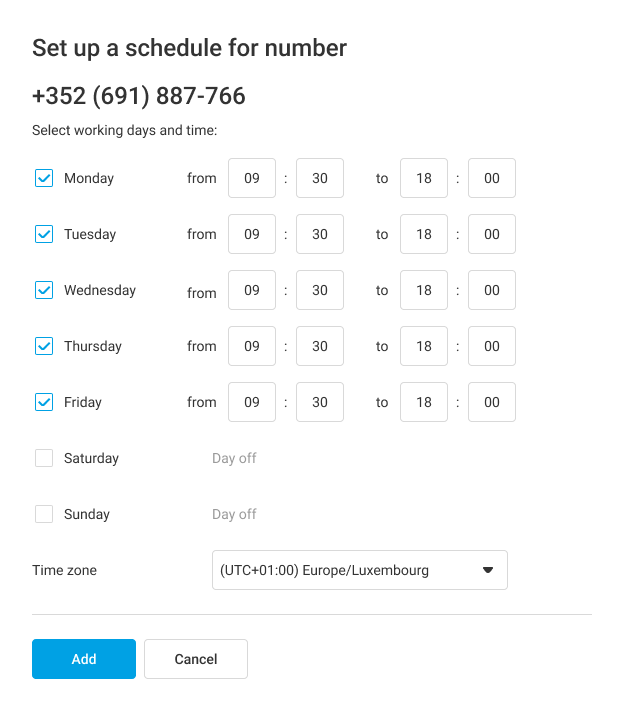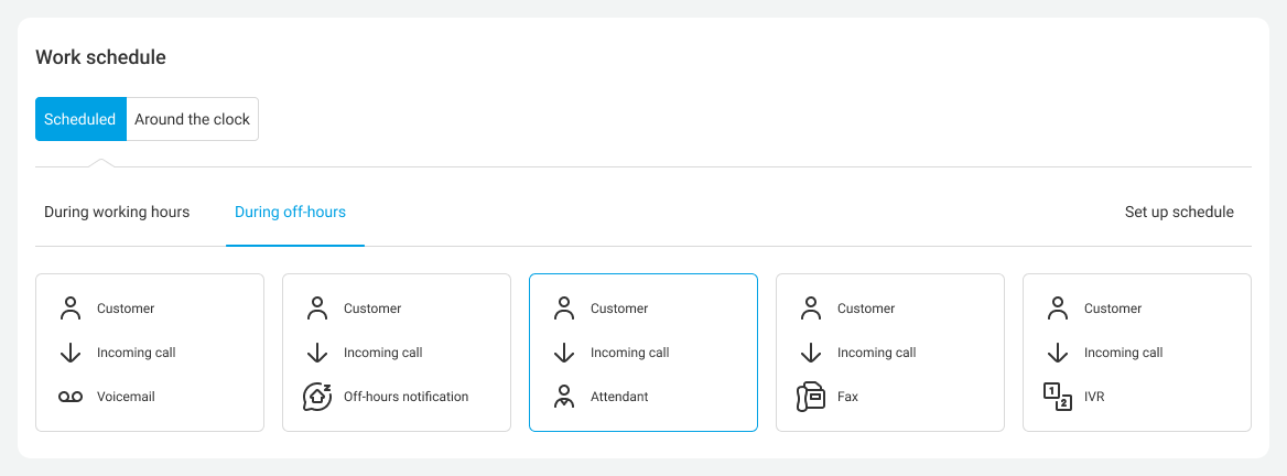 Here, you can set up a call-receiving schedule during working hours and choose where to forward calls during off-hours.
