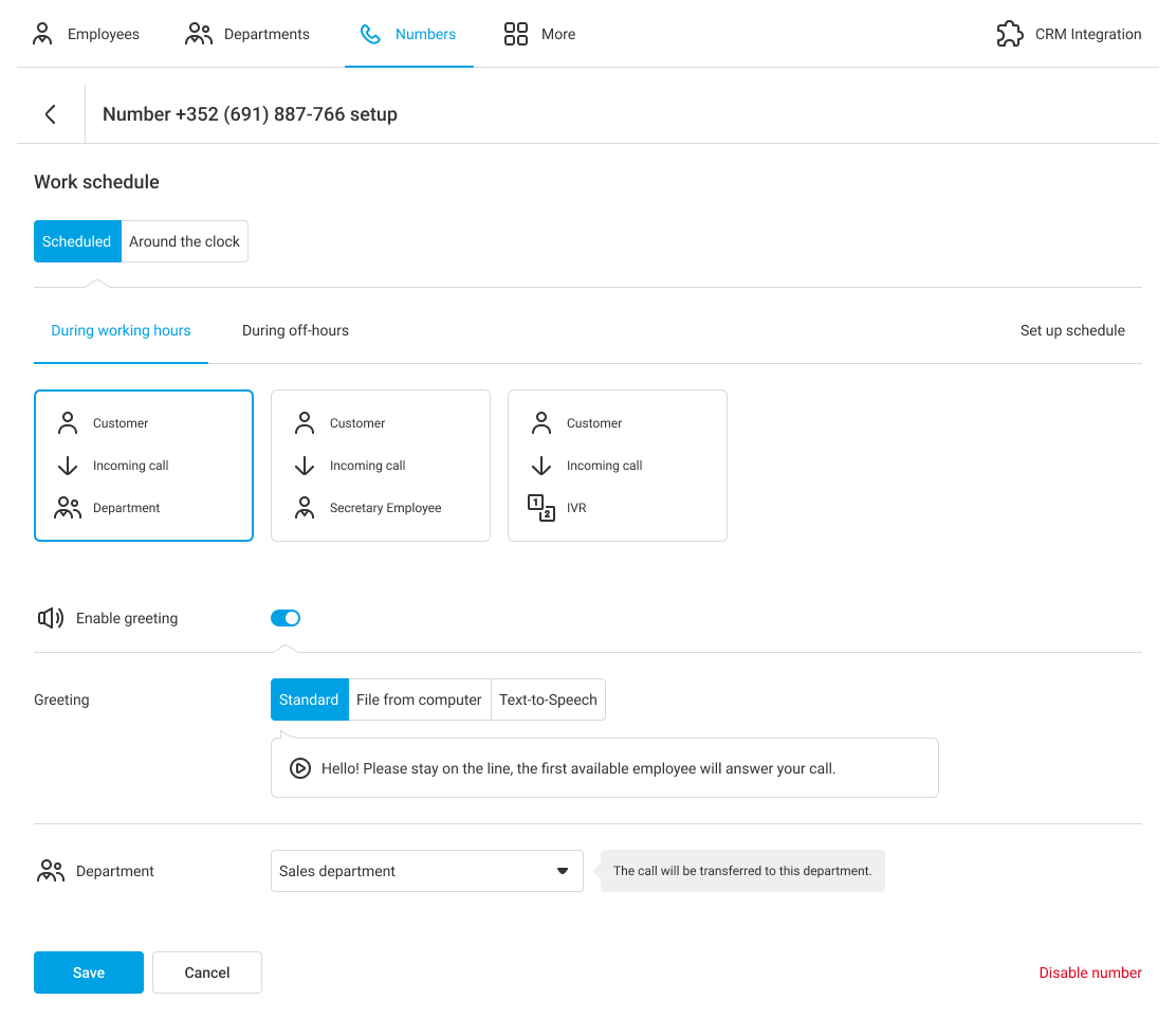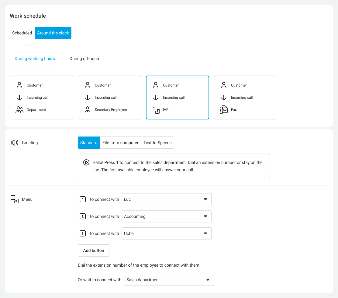 During working hours, a call can be forwarded to a department, an employee, or an interactive voice response (IVR). You can use a default voice greeting, upload your file, or synthesize speech in Cloud PBX.