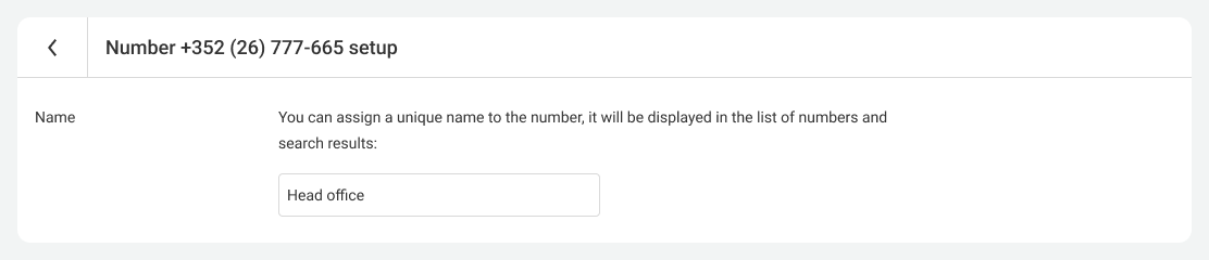 On the number settings page, enter a unique name. It should be short (no more than 60 characters) and informative. For example, “Berlin Office” or “Sales Department.” At the bottom of the page, do not forget to click Save.