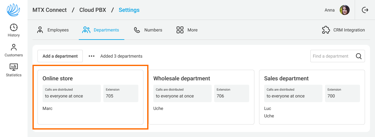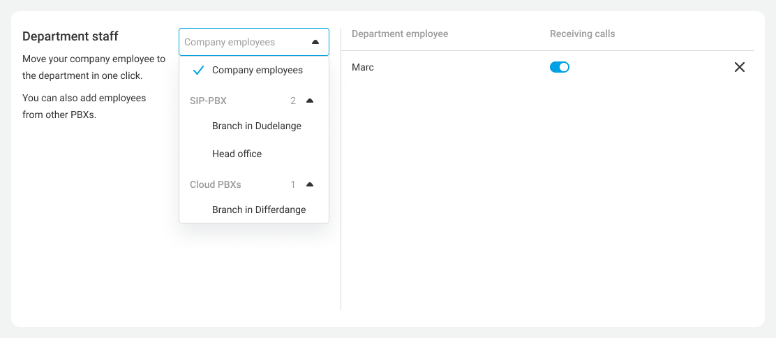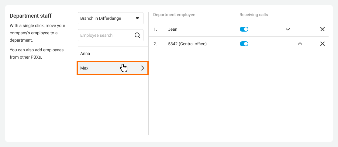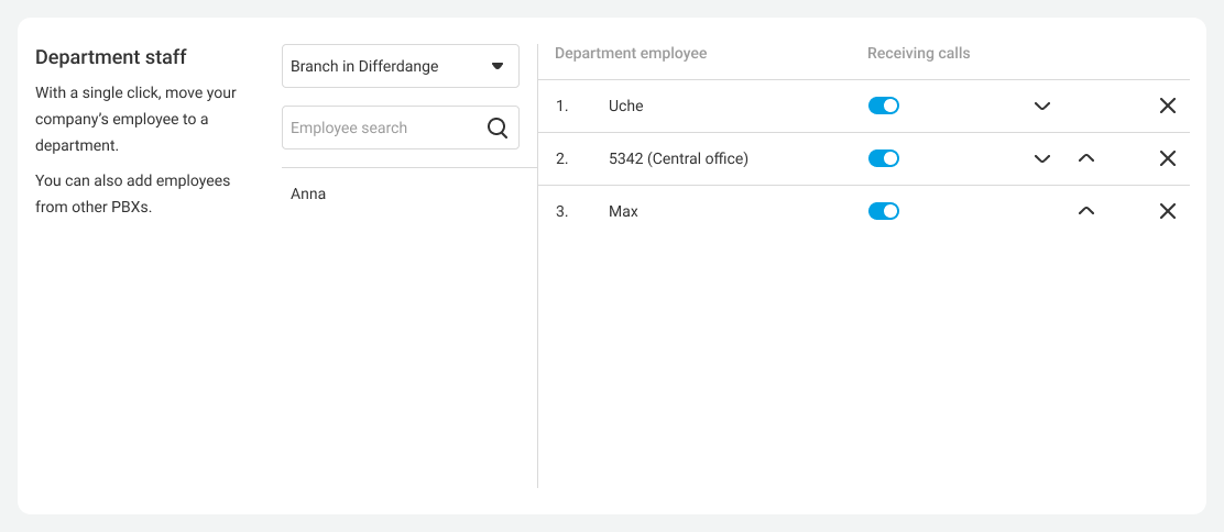 4. You can change the order in which employees from other PBXs receive calls, temporarily exclude them from this queue or completely remove them from the department, just like any other Сloud PBX employee.