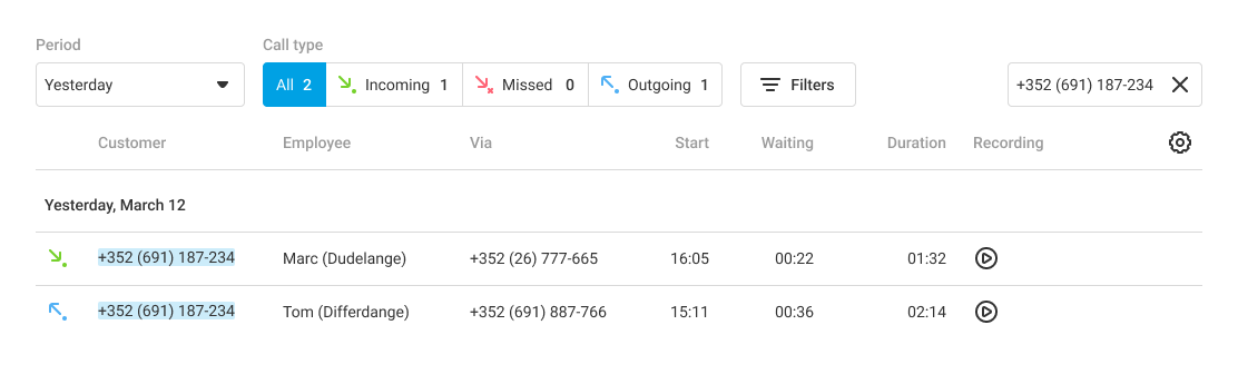 Now, your department calls, which were received or made by an employee from another PBX, will be displayed in your History and their recordings can be listened to. In the Employee column, the name of the branch to which the employee belongs will be displayed in brackets, and in the Via column — the number of the Cloud PBX in which the department with this manager is set up.
