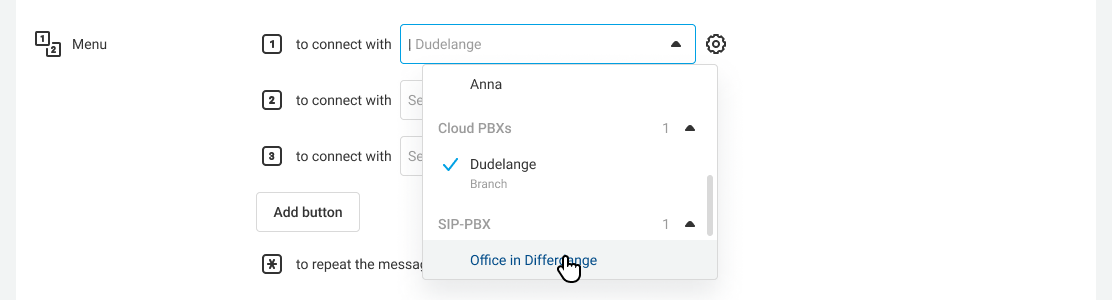 2. Open the drop-down list next to the button you want to assign to forward calls to an employee from another PBX. Find the Cloud PBX section in the list if you want to make an employee from another Cloud PBX available through the IVRu. If you want to add an extension number of a SIP-PBX employee, find the SIP-PBX section.