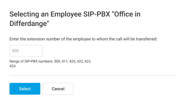 - If this is a SIP-PBX, then enter the employee’s extension number. So that you do not have to look for this number in the SIP-PBX settings, the entire range of available numbers for the selected PBX is listed under the number entry window.