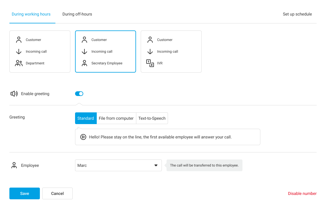 1. In the number settings select the Scheduled operating mode and go to the During working hours tab. Select the scenario: Customer — Incoming call — Secretary Employee.