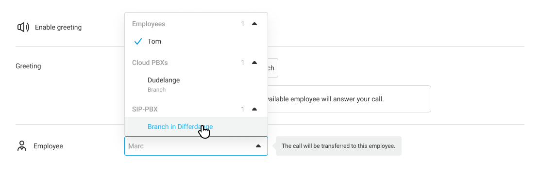You can add an employee from another PBX to the IVR — to contact them, dialing an extension number or selecting a call direction will be needed. For this: