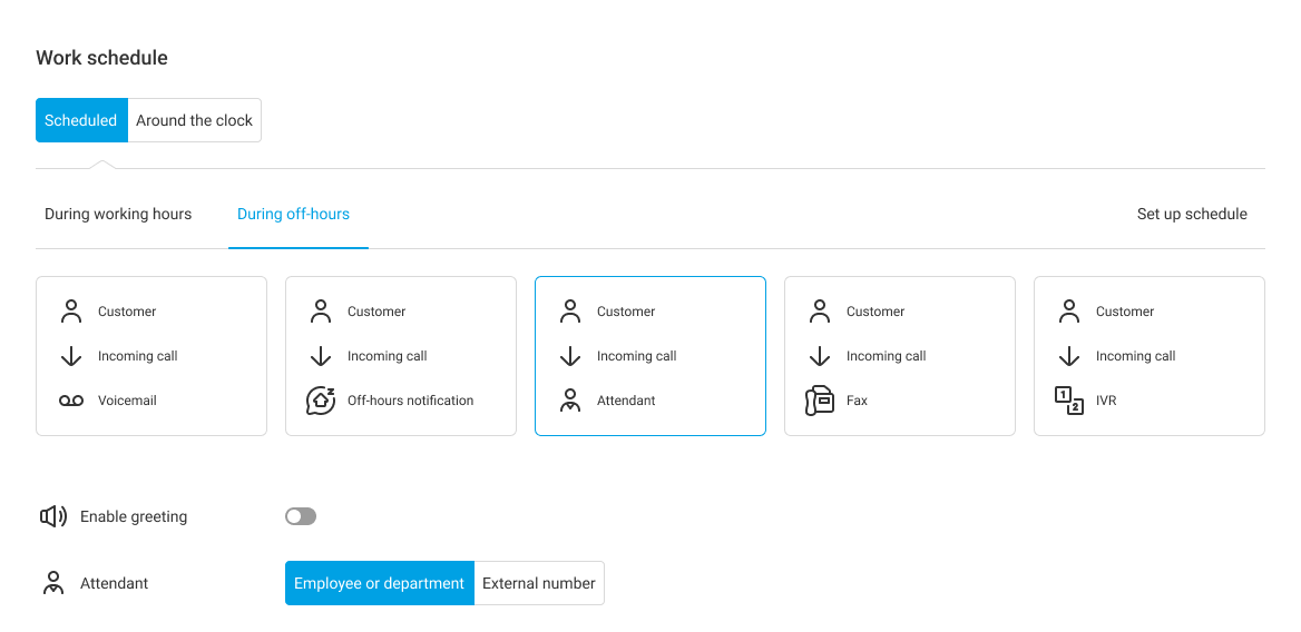 1. In the number settings, select the Scheduled operating mode and go to the During off-hours tab. Select the scenario: Customer — Incoming call — Attendant.