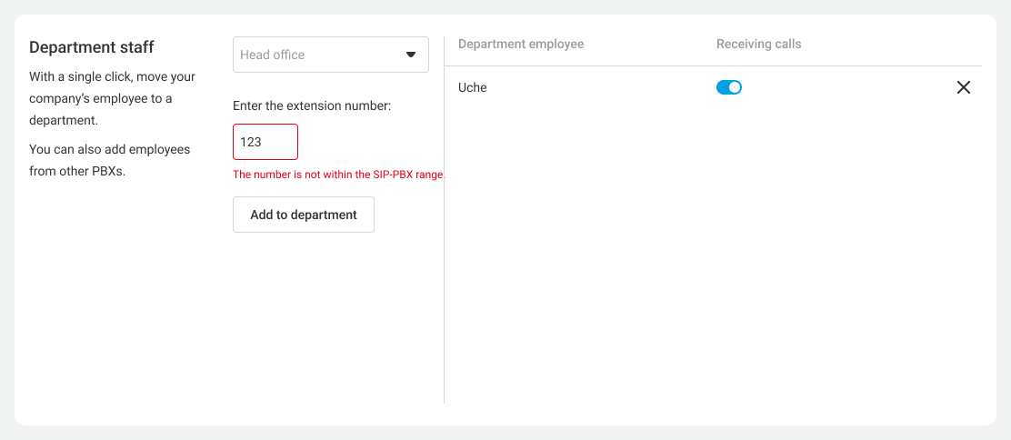 1. When you select a SIP-PBX, a window for entering an extension number will appear below. Enter the number of the employee you want to add and click the Add to department button.