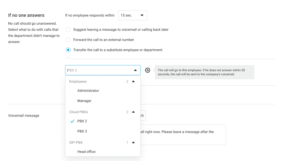 When department employees don’t answer within a certain amount of time, the call can be transferred to a substitute employee or department. To do this, in the department settings in the If no one answers section, you need to select Forward the call to a department or a substitute employee. To use an employee from another PBX as a substitute one, specify another PBX in the drop-down list.