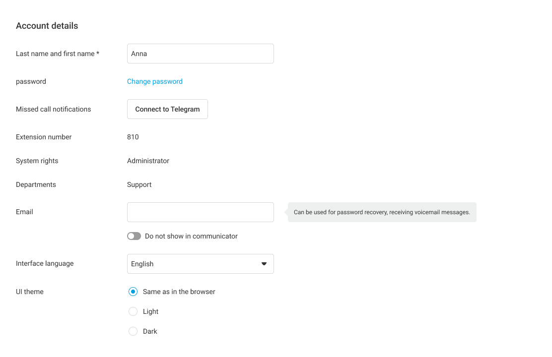 In the Account details section you can change your password for logging in to Cloud PBX and email address for password recovery and receiving messages.