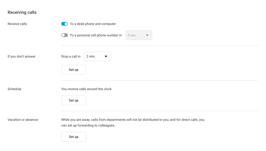 In the Receiving calls section you can set up important criteria for an employee's work, namely: