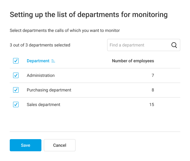 3. Select the departments the calls of which will be available for Monitoring. Click Save.