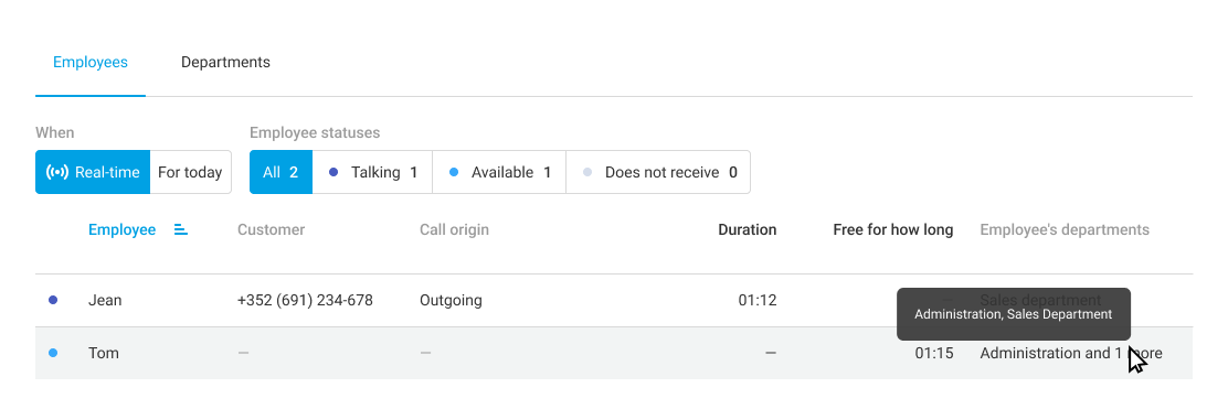 - Duration — if an employee is talking, the duration of the current call is displayed here, and the longest call has an icon with an exclamation mark.