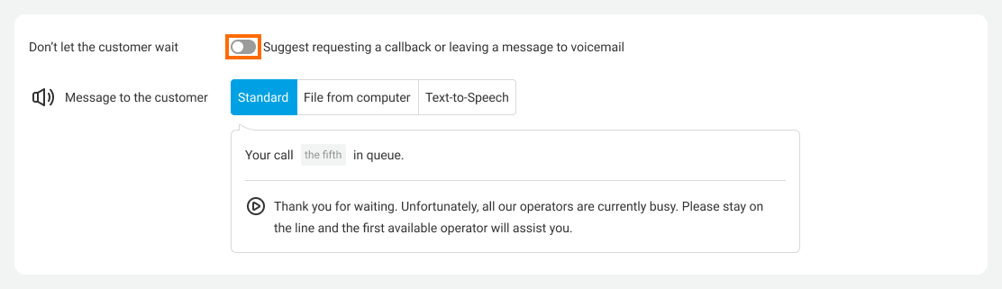 You can offer your customers to request a callback if they don’t want to stay on the line. In this case, a caller retains their position in a queue, and once one of the department employees becomes available, the system will first call the employee and then the customer.